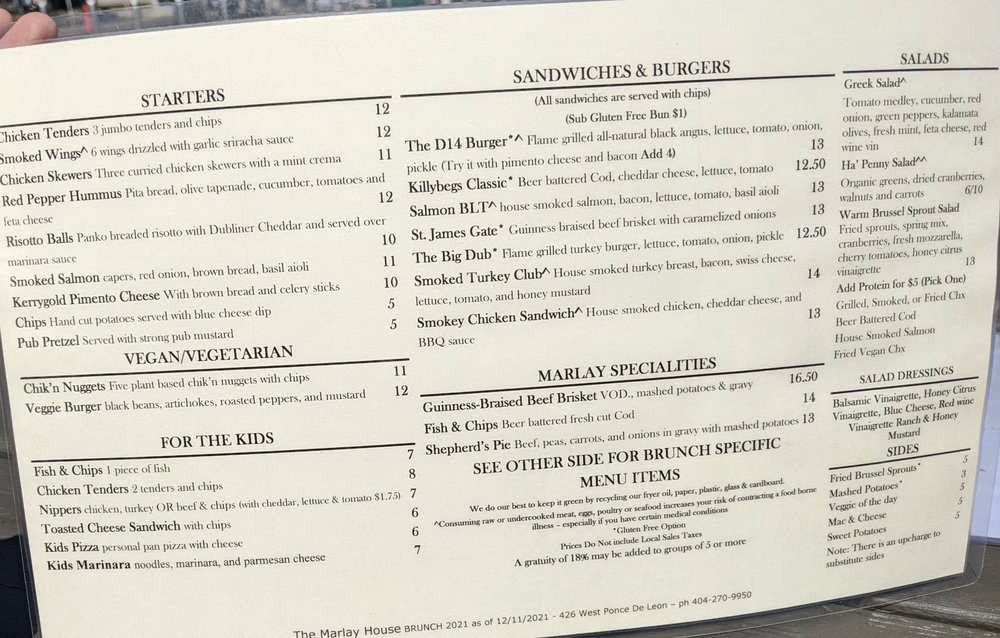 Nestled in Decatur, GA, The Marlay House offers a cozy Irish pub experience with a twist of elevated cuisine. With a diverse menu that caters to both meat lovers and vegetarians, this spot is a gem for foodies looking for a unique dining experience. From classic dishes like fish and chips and Sheppard's Pie to innovative options like Orange Chick'n with cauliflower rice, the food at The Marlay House is sure to delight your taste buds. The spacious indoor and outdoor seating areas provide a relaxed setting to enjoy a meal with friends or family. And with a selection of local and regional beers to complement your meal, you'll find yourself coming back to try more of what The Marlay House has to offer. Don't forget to save room for their delectable bread pudding for a sweet ending to your meal. Experience the best of Irish cuisine with a modern twist at The Marlay House.